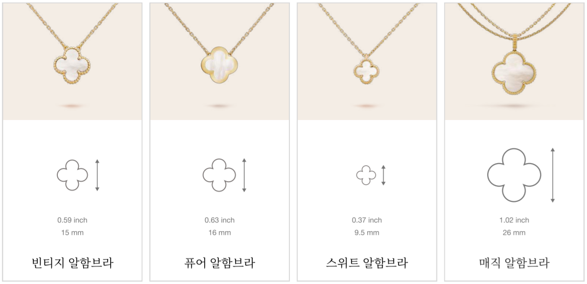 반클리프 목걸이의 알함브라 컬렉션은 목걸이 펜던트(장식모양)의 사이즈별로 세부 컬렉션이 나뉩니다.