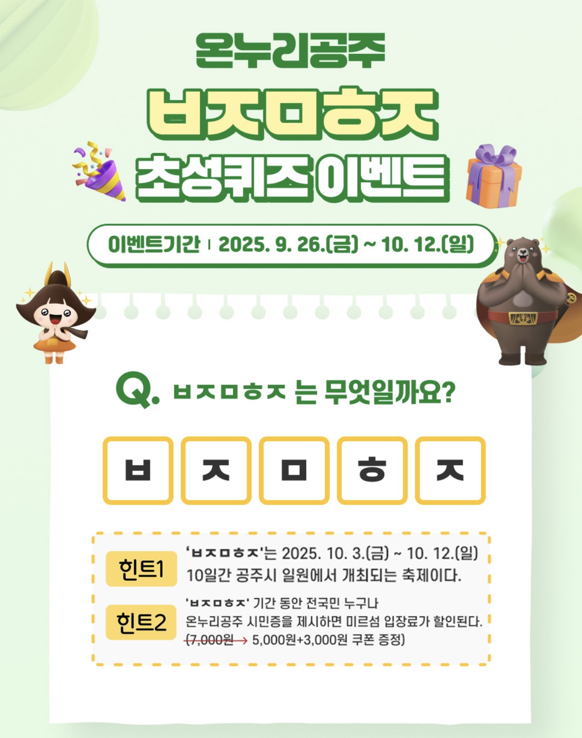 카테고리 없음 온누리공주 초성퀴즈 이벤트 by rena17 2025. 10. 2. 반응형 온누리공주 사이트에서 초성퀴즈 이벤트를 합니다답은 백제문화제 가 맞을까요? 이벤트 > 이벤트 >이벤트 이벤트온누리공주cyber.gongju.go.kr 반응형 공유하기 게시글 관리 오늘의 정보 댓글