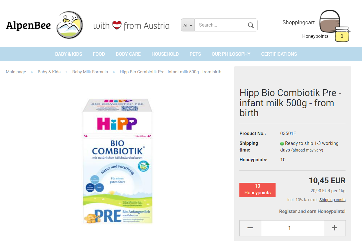 엄마들 사이에선 이미 유명세를 떨치고 있는 알펜비 사이트(https://alpenbee.at/en)입니다. 비록 영어로 된 사이트이지만 크롬 브라우저를 이용하면 한국어로 즉시 번역이 가능합니다. 사실 사이트 자체가 직관적이기 때문에 영어로 사용해도 큰 어려움은 없습니다.