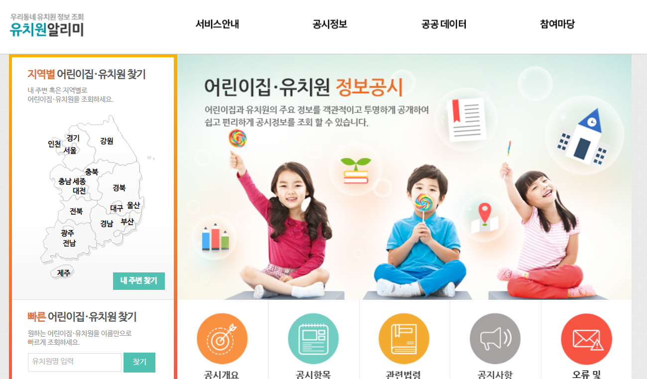 유치원 알리미는 전국 곳곳의 유치원을 모두 조회할 수 있습니다. 유치원 설립유형, 설립일과 운영시간, 교육시간, 영양 및 환경정보, 회계정보, 교육과정 등을 해당 원에 대한 모든 정보를 공개하고 있습니다.
