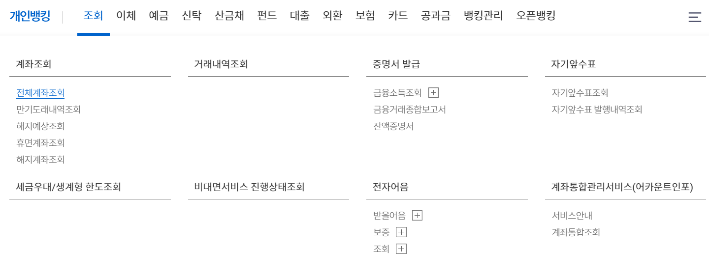 2. 상단 메뉴 중 조회>계좌조회>전체계좌조회 를 눌러 내 계좌목록을 확인합니다.