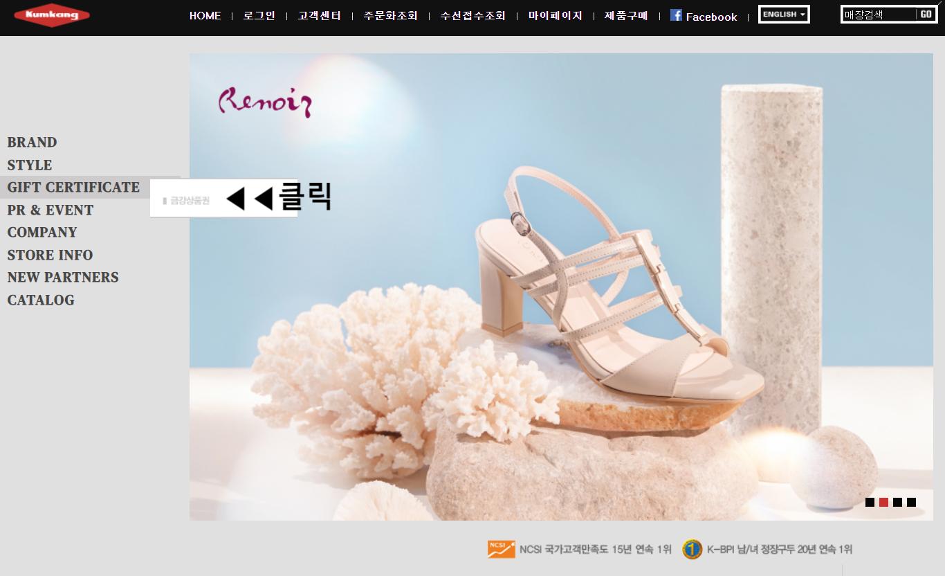 1. 금강제화 홈페이지(www.kumkang.com)로 이동하여 GIFT CERTIFICATE 메뉴에서 금강상품권을 클릭합니다.