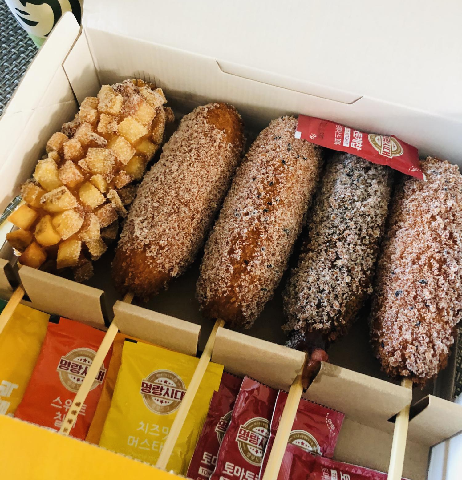 여기에 핫도그 포장 직전에 설탕에 굴려주기 때문에 30~50칼로리가 추가됩니다. 따라서, 메뉴마다 차이는 있으나 대략 450칼로리 정도라고 생각하면 되겠습니다.