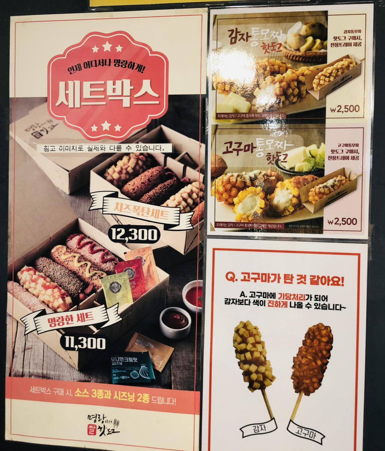 - 명랑한세트 11,300 : 핫도그5개 (감자통모짜/고구마통모짜 중 1개+통모짜/숯불갈비맛/감자/모짜체다 중 2개+모짜렐라/점보/먹물치즈/체다치즈 중 2개 선택)