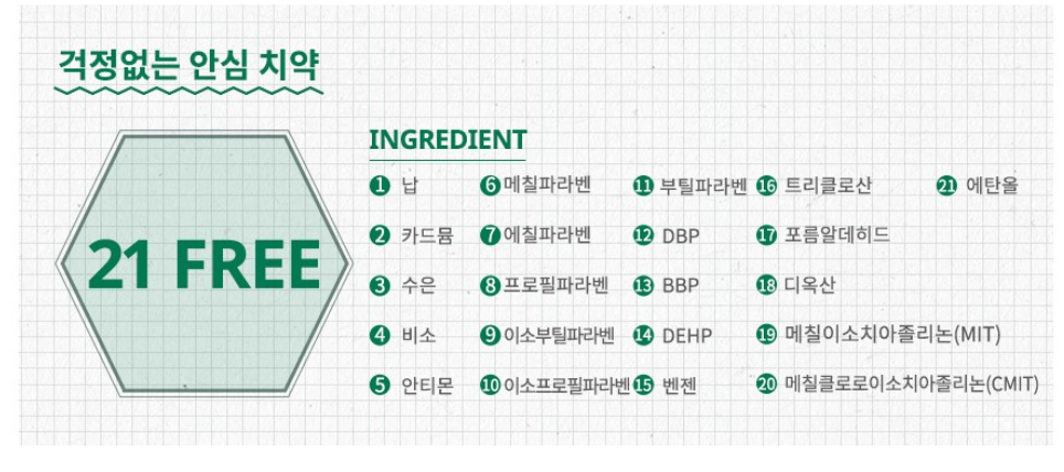 덴티스테 플러스 화이트는 벤젠, 파라벤, CMIT/MIT, 트리클로산 등 21가지 유해성분이 없음을 인증받았습니다. 가습기살균제 사건 이후로 사람들은 평소 자주 사용하는 화장품이나 치약 등의 화학품에 대해 관심과 주의가 아주 커졌는데요. 입으로 들어가는 치약은 그 중요도가 더 높겠습니다.