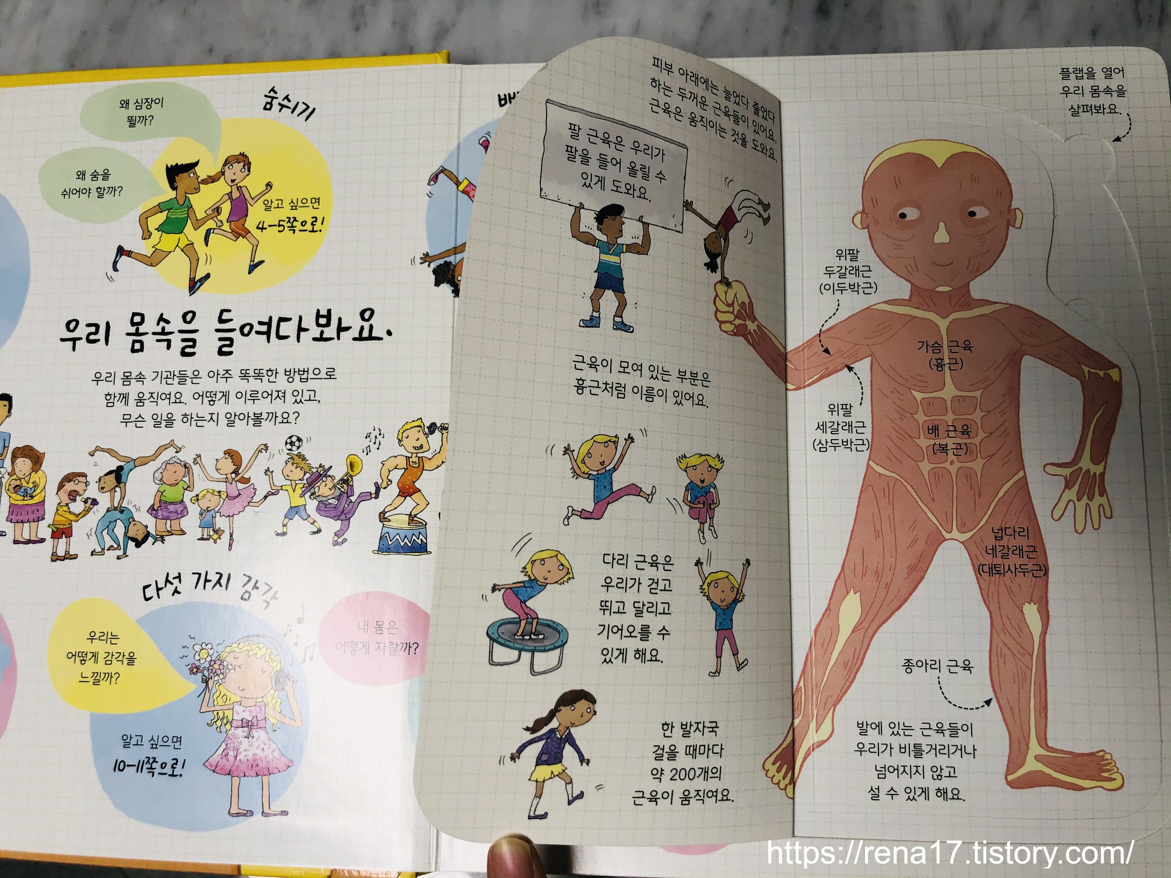 아이가 본인 몸의 이 곳 저 곳을 묻기 시작합니다. 팔, 다리, 눈, 코, 입 을 물어볼 때만 해도 기분좋게 설명해나갔지만 점점 질문은 심화되어 갑니다. 아빠 다리는 접었다 펼때 왜 소리가 나는지, 볼을 꾹 누르면 왜 딱딱한지, 손바닥은 왜 빨간지 등을 물어 나가는데요. 그래서 준비했습니다. 어스본의 유명 플랩북 요리조리 열어보는 시리즈의 '우리몸' 입니다.