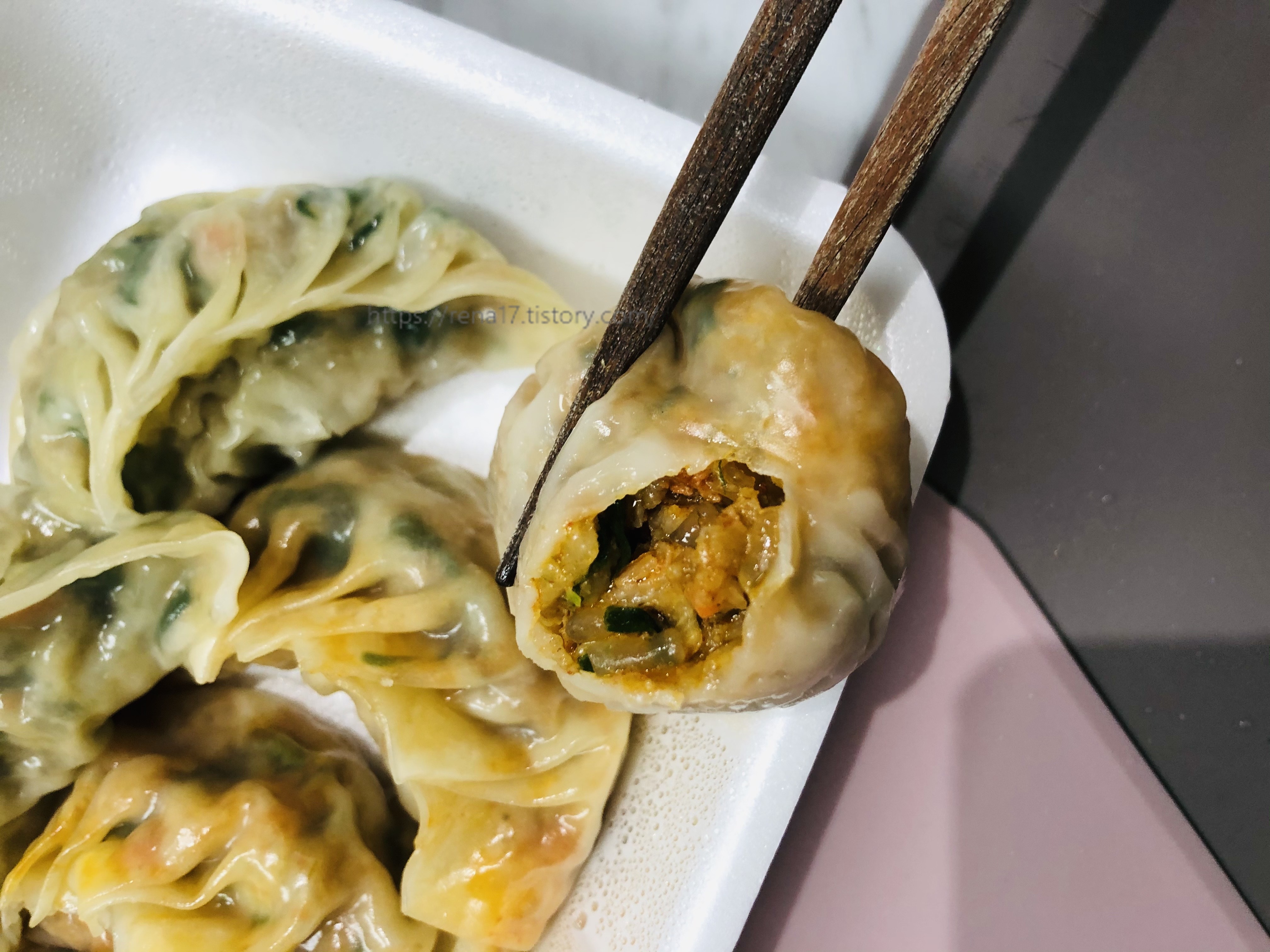 - 만두피가 일반 만두처럼 얇습니다. 얇은 피라고 해서 별다르게 매우 얇은가? 했지만 그건 아니었습니다. 아마도 왕만두와 비교했을 때 피가 얇은 만두라는 의미 같습니다. 고기 맛, 김치 맛 두 가지이고 반반 섞어 주문도 가능했습니다.