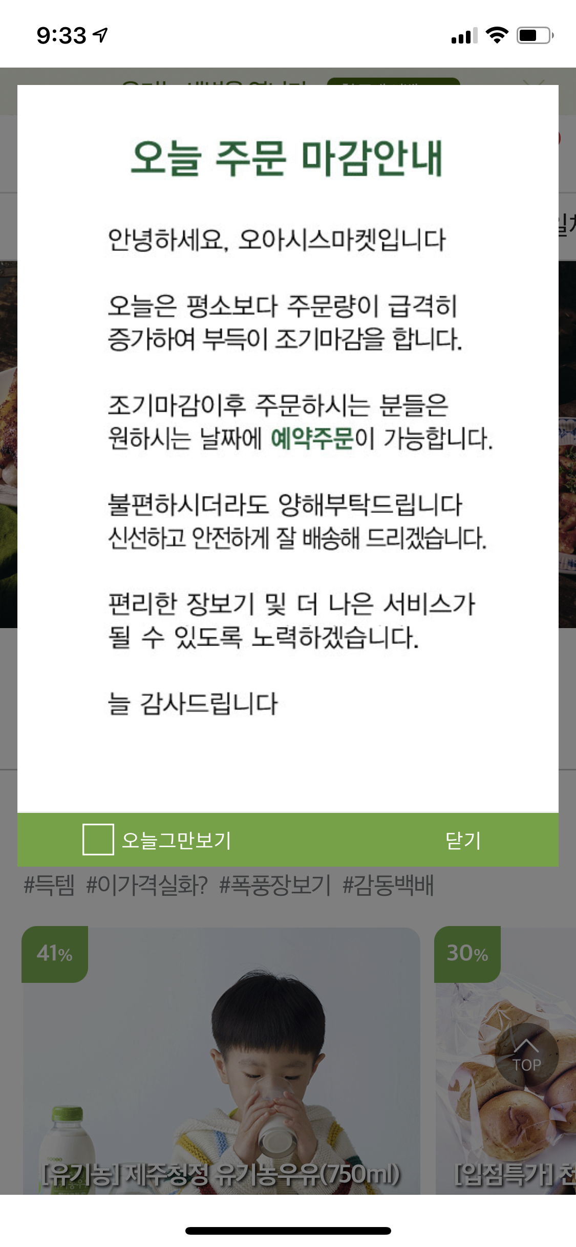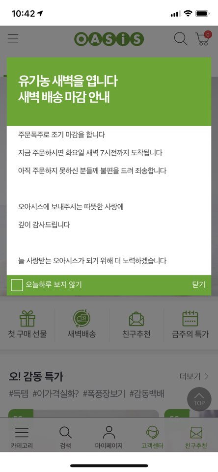 강화된 사회적 거리두기와 함께 겨울철 한파까지 겹쳐 사람들의 외출이 줄어든 요즘에는 오아시스 주문이 동나기도 합니다. 오아시스는 밤 11시까지 주문완료 하면, 다음날 오전 7시 이전에 받아볼 수 있는 새벽 배송 서비스를 하고 있는데요. (그것도 3만원 이상 주문이면 무료배송이에요) 코로나가 본격 퍼지기 시작한 3월경에는 밤 10시쯤 조기마감을, 최근에는 오후 6시만 되더라도 다음날 새벽배송이 조기 마감되었다는 안내 화면이 뜨고 있습니다.